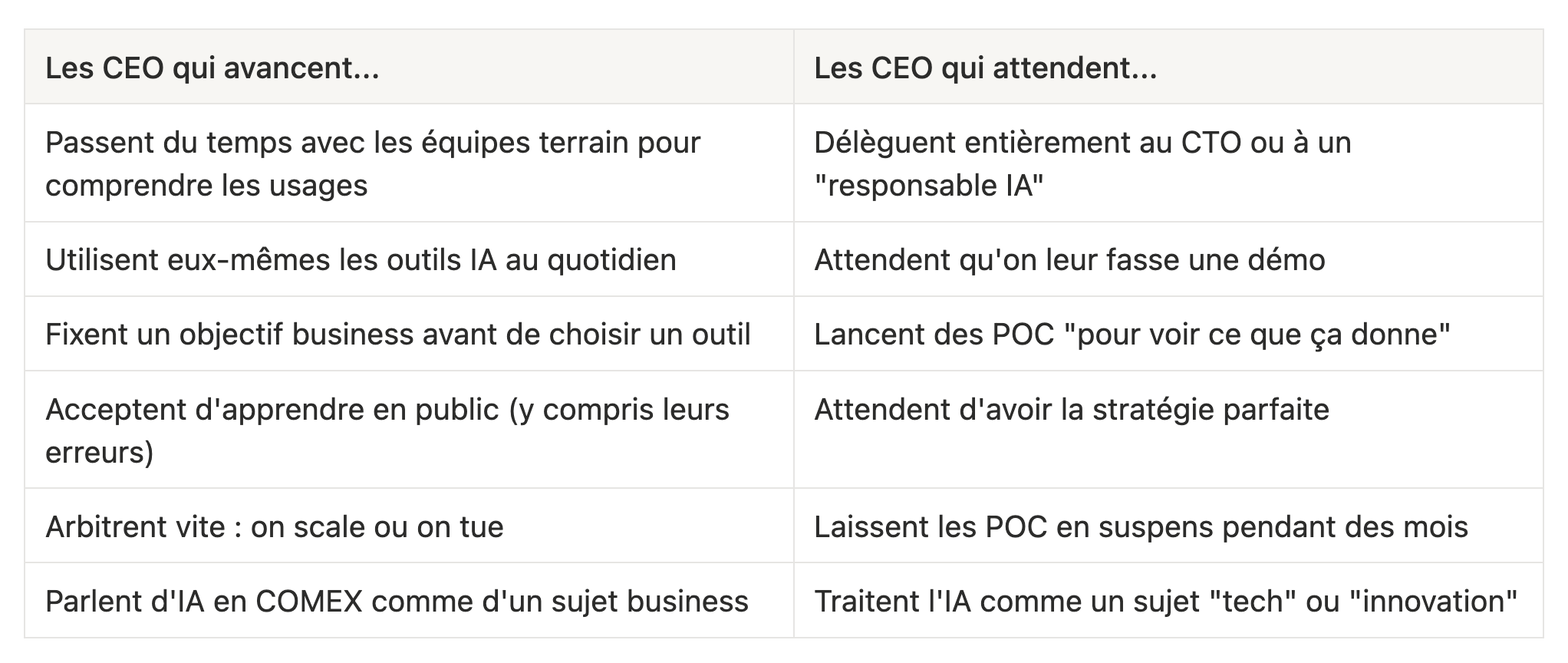 💡 À retenir : “L’IA n’est plus un sujet tech. C’est un sujet de direction générale. Les CEO qui ne s’en emparent pas perdent la main sur leur propre vélocité.”